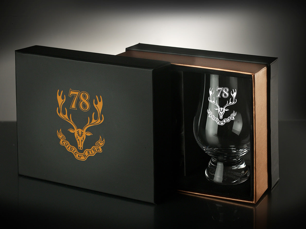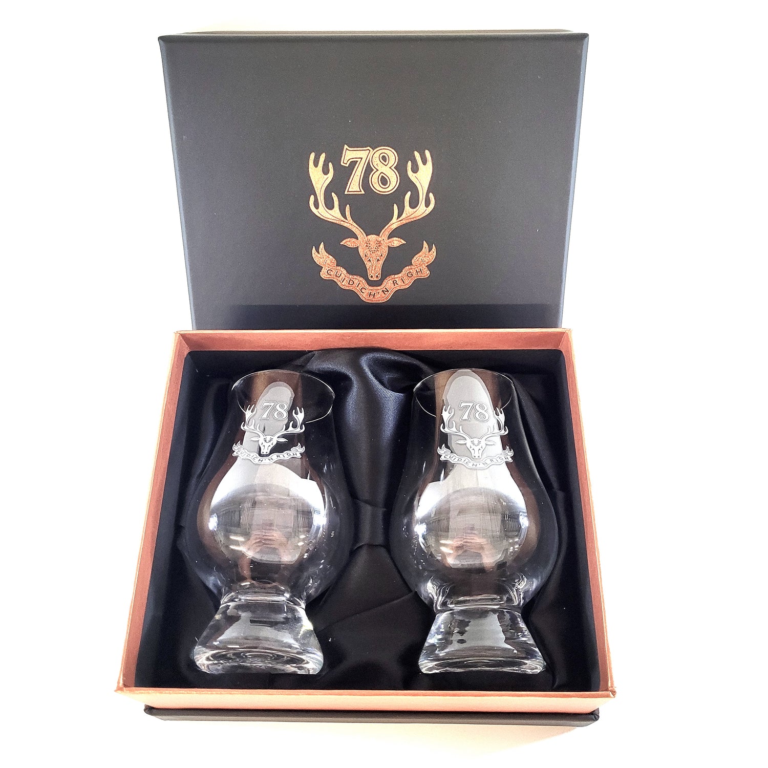 A pair of crystal 78th Highlanders official Glencairn Glasses tucked into a soft, black silk bed bound by a satin black and metallic copper tone Presentation Box.