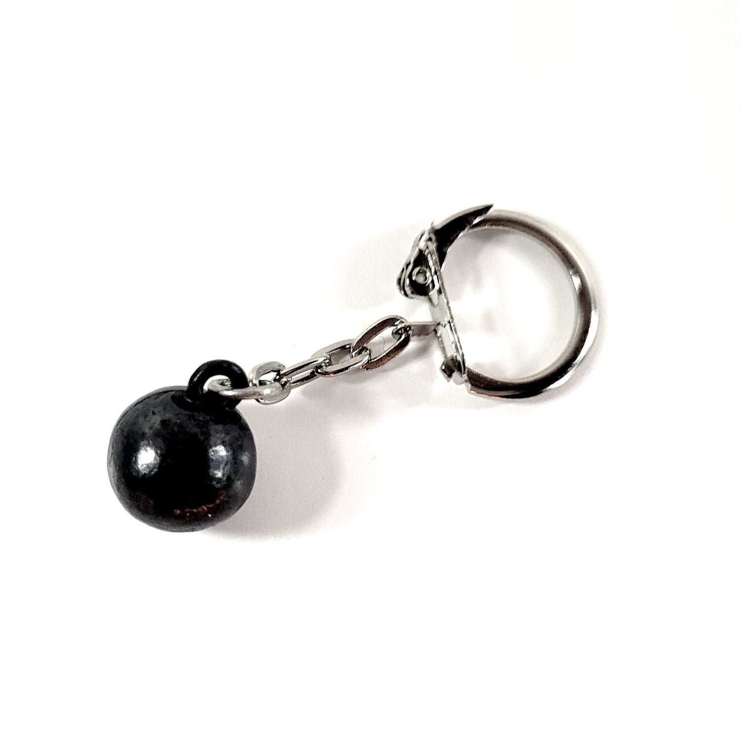 A miniature resin cannonball attached to a key chain.