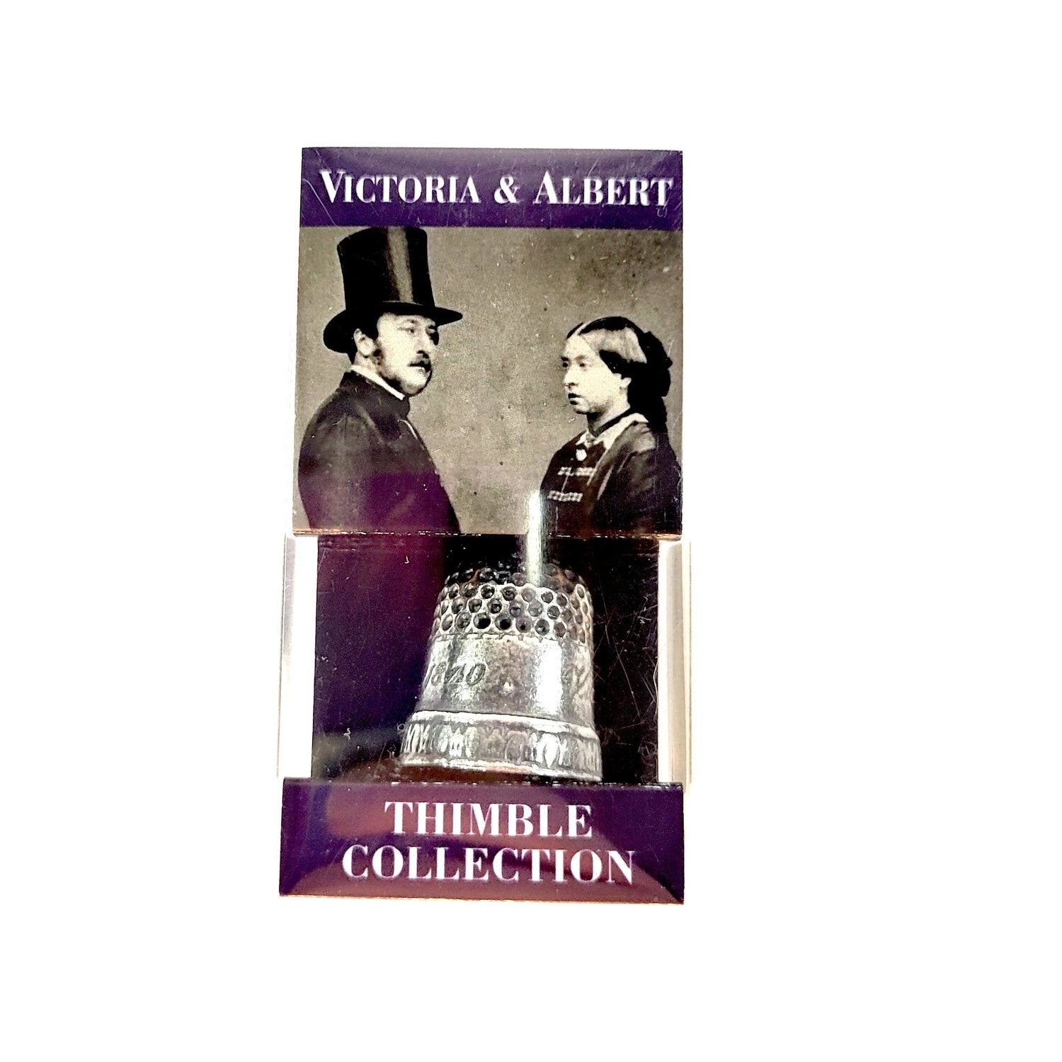 A reproduction of a Victorian thimble supplied in a clear box with information card, explaining about Victoria's marriage to Prince Albert and this commemorative thimble.
