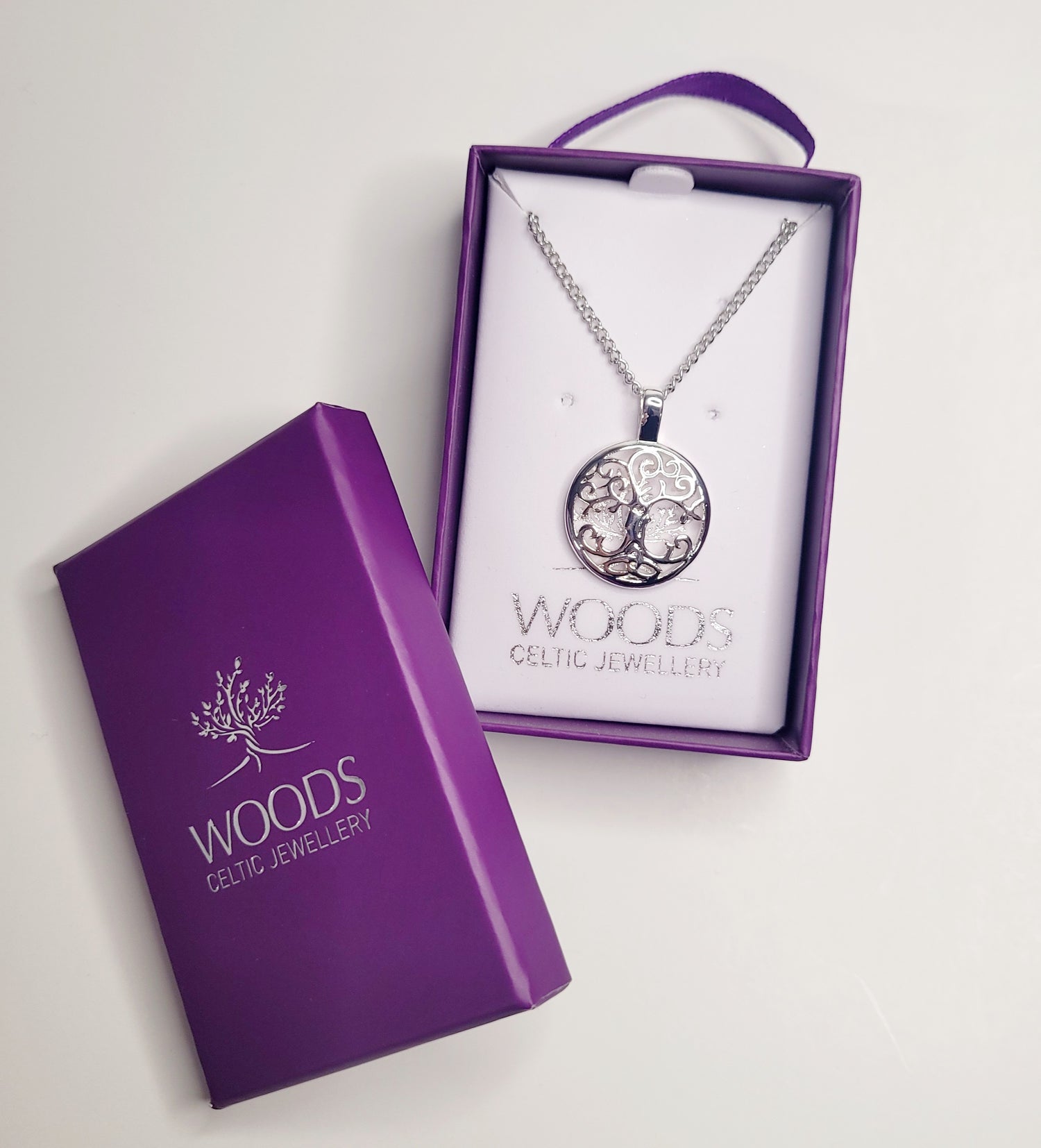 Silver Plated pendant in Tree of Life design on a 18" chain. Boxed in a signature purple hanging box.