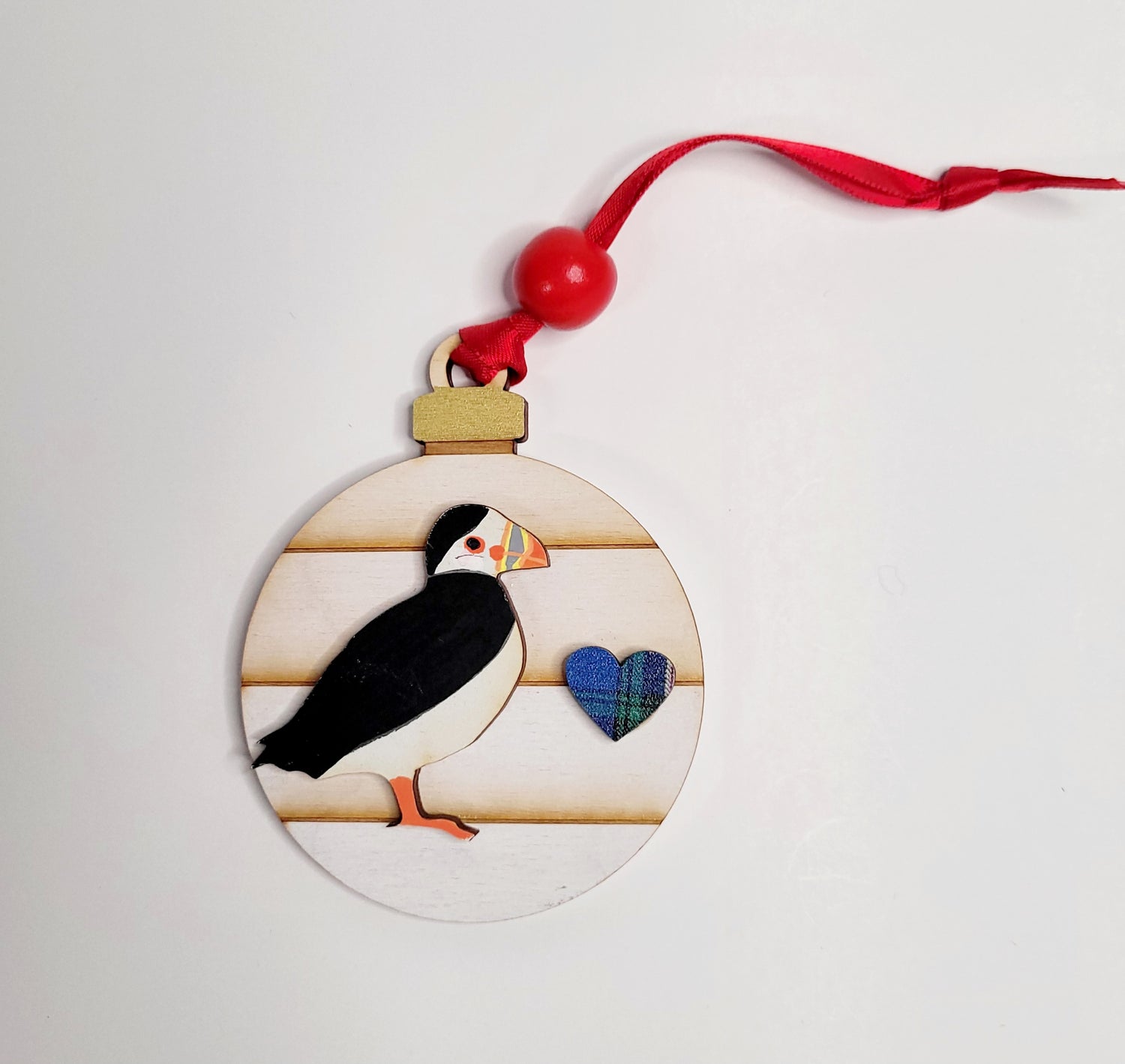 This ornament features an Atlantic Puffin and a Nova Scotia tartan heart.
